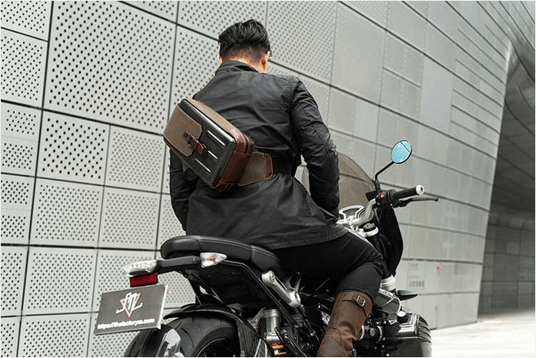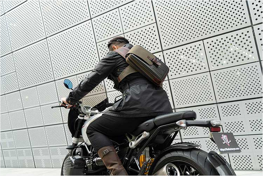 カーボンハードシェル、オイルプルアップレザー、ワックスキャンバスの組み合わせで作られています