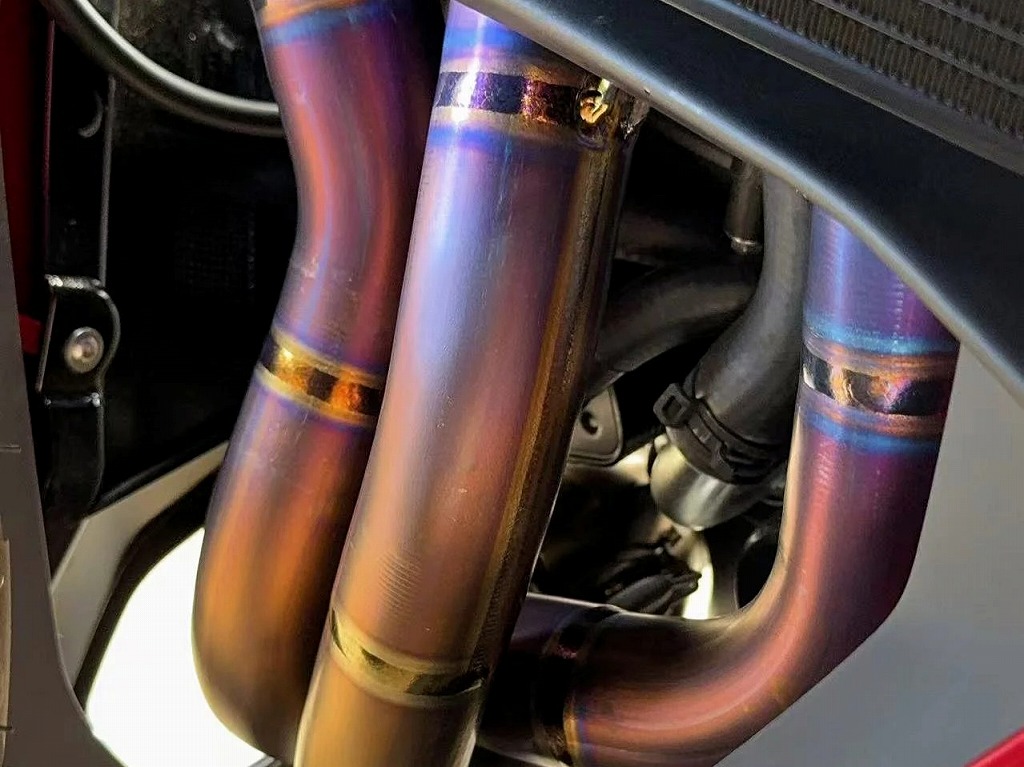 表面仕上げはナチュラルブラッシュドチタンで熱が入ると鮮やかな虹色に変化します